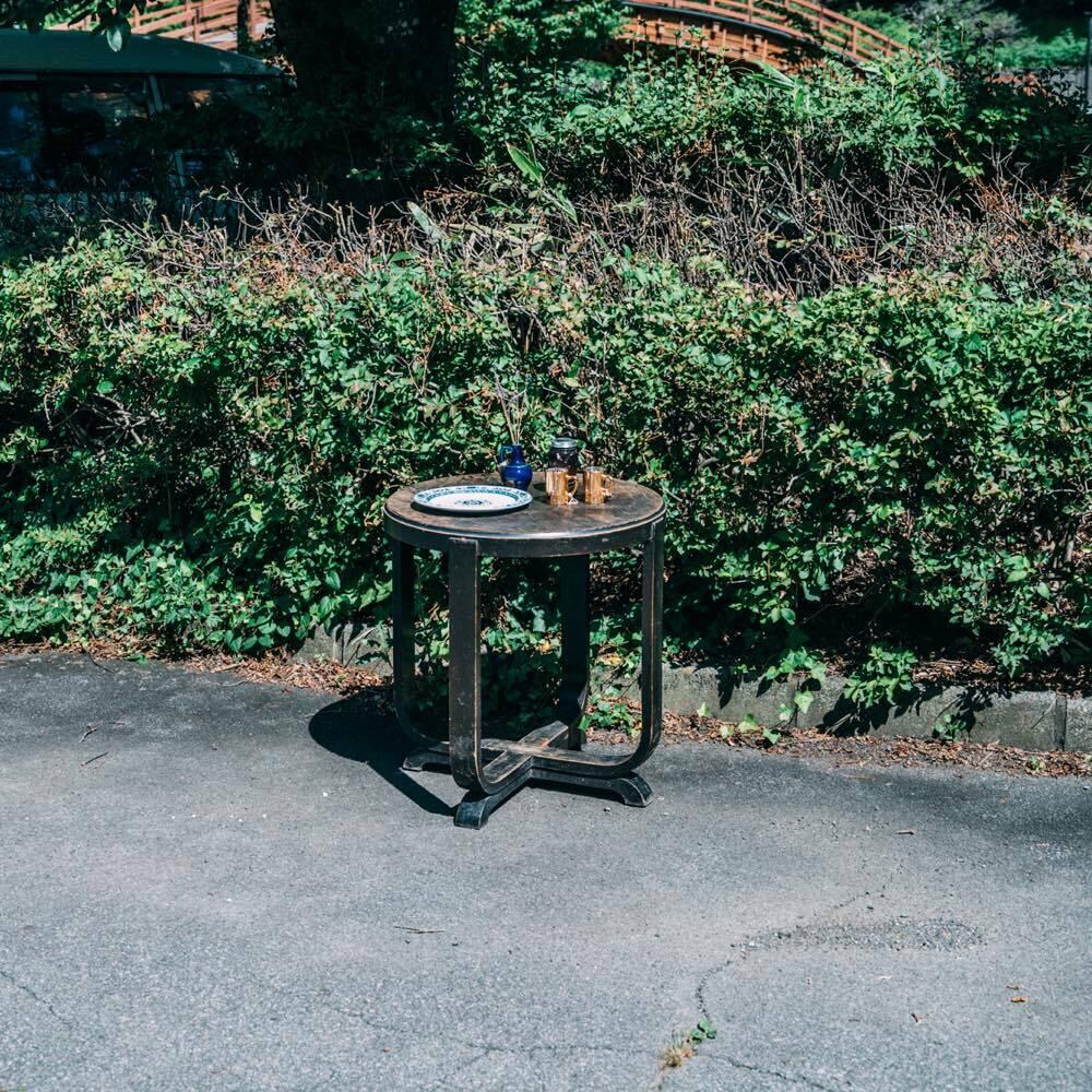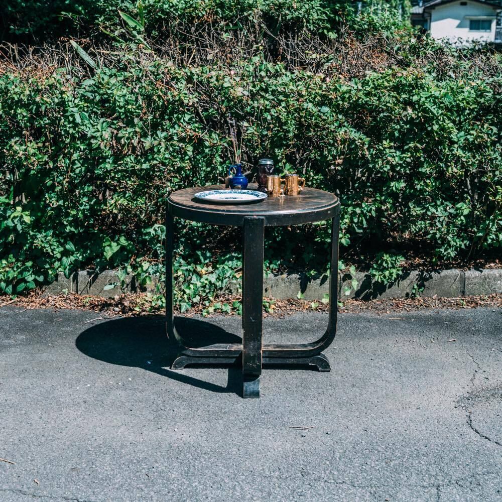 昭和初期の時代に造られたであろう黒色のモダンな丸テーブル。